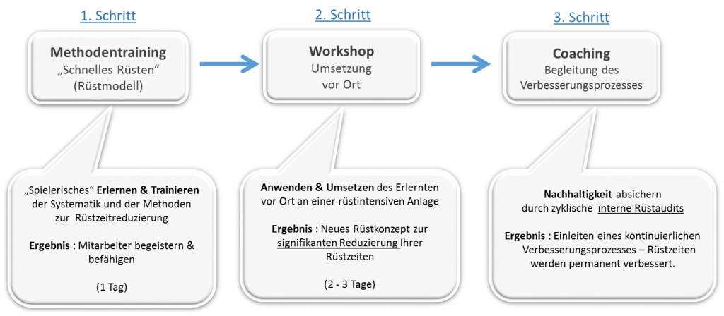 Dabei geht es neben technischen Verbesserungen, primär um die Entwicklung einer optimalen Rüstorganisation bzw. eines Rüststandards. Prozessverluste (Such- und Wegzeiten, Wartezeiten, Störungen im Prozess, Handlingszeiten, etc.) werden gemeinsam mit den Mitarbeitern analysiert und stark reduziert. Auf dieser Basis wird ein dynamischer Rüststandard (optimiertes Rüstkonzept) entwickelt.